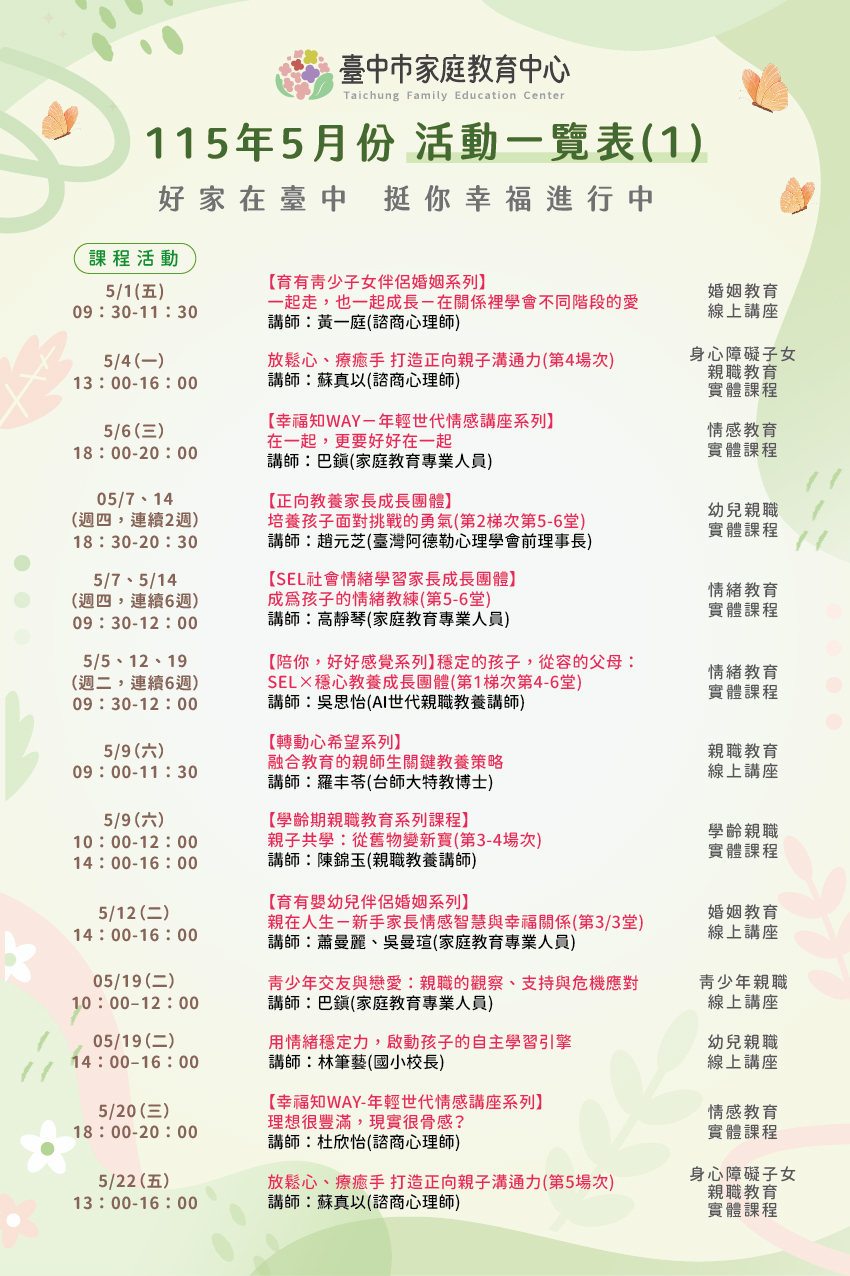 臺中市家庭教育中心辦理115年5月份活動一覽表,相關訊息可至臉書粉絲頁參閱
